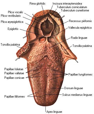 Слизистая оболочка языка, tunica mucosa linguae, гладкая в области корня, нижней поверхности тела и верхушки и шероховатая на спинке языка. Эта шероховатость обусловлена большим количеством мелких возвышений сосочков языка, papillae linguales.