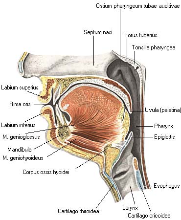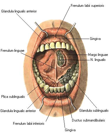 а) Переднюю язычную железу, glandula lingualis anterior, в виде продолговатого образования, располагающегося по обе стороны от переднего конца m. genioglossus, вблизи и кзади от верхушки языка Выводные протоки открываются на нижней поверхности языка вдоль бахромчатой складки. Кроме того, эти железы могут располагаться в виде небольших групп в задней части бокового края языка в глубине мышц (mm styloglossus et palatoglossus). Выводные протоки их открываются в складках papillae foliatae;