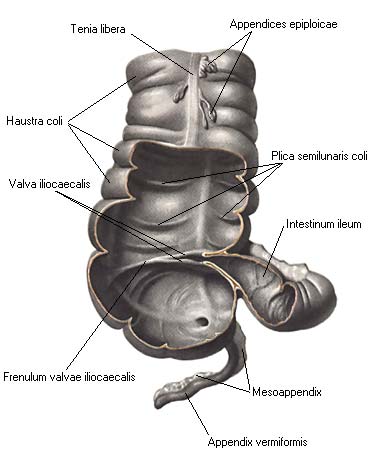 Слепая кишка, сесит, — начальный участок толстой кишки, по форме является слепым мешком, расположенным ниже места впадения подвздошной кишки (аналогично своду желудка, расположенному слева и выше кардиальной части). Длина ее колеблется у разных людей от 3 до 8 см, ширина составляет 4—7 см и является из всех отделов толстой кишки (исключая ампулу прямой кишки) наибольшей. Слепая кишка чаще всего одета брюшиной со всех сторон и расположена, таким образом, внутрибрюшинно, но может также лежать и мезоперитонеально, т.е. быть покрытой брюшиной с трех сторон. От эаднемедиальной ее стенки, на 0,5—5 см ниже илеоцекального угла, образуемого впадением подвздошной кишки в слепую, отходит червеобразный отросток (аппендикс). appendix vermiformis. Он представляет собой узкую трубку диаметром 3—4 мм, длиной от 2,5 до 15 см. Просвет червеобразного отростка сообщается с просветом слепой кишки. Отросток имеет собственную брыжейку, mesoappendix, соединяющую его со стенкой слепой кишки и концевым (терминальным) отделом подвздошной. Обычно червеобразный отросток лежит в правой подвздошной ямке; свободный конец его обращен вниз и в медиальную сторону, достигает пограничной линии (linea terminalis) и иногда спускается в малый таз. Однако это положение не постоянно для всех людей: червеобразный отросток может быть расположен, например, позади слепой кишки, будучи покрыт и фиксирован к ней брюшиной, или при мезоперитонеальном ее положении лежать даже внебрюшинно.