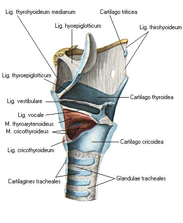 Голосовая мышца, m.. vocalis (см. ниже), также принимает участие в суживании голосовой щели. Мышцы, расширяющие голосовую щель. Задняя перстнечерпаловидная мышца, m.. cricoarytenoideus posterior, парная, начинается от задней поверхности перстневидного, хряща и, направляясь косо вверх и латерально, прикрепляется к processus muscularis черпаловидного хряща. Мышца вращает черпаловидный хрящ так, что голосовые отростки обоих черпаловидных хрящей, а значит, и прикрепляющиеся к ним голосовые связки удаляются одна от другой и тем самым голосовая щель расширяется. Мышцы, напрягающие голосовые связки. Перстнещитовидная мышца, m.. cricothyroideus, парная, располагается на переднебоковой поверхности гортани, по бокам от средней линии. Она начинается от дуги перстневидного хряща и, направляясь косо вверх и латерально, прикрепляется к нижнему краю щитовидного хряща вплоть до нижнего рога. В мышце различают прямую часть, pars recta, которая отделяется у нижнего щитовидного бугорка от косой части, pars obliqua, расположенной кзади и идущей почти горизонтально. Мышца наклоняет щитовидный хрящ кпереди, в результате чего он отдаляется от черпаловидного хряща и голосовые связки напрягаются. Мышцы, расслабляющие голосовые связки. Щиточерпаловидная мышца, m.. thyroarytenoideus, располагается горизонтально в переднезаднем направлении, прилегая к внутренней поверхности щитовидного хряща. Наружная часть этой мышцы начинается от внутренней поверхности щитовидного хряща по бокам от средней линии и, направляясь кзади, прикрепляется к переднебоковой поверхности черпаловидного хряща в области crista arcuata и fovea triangularis. Голосовая мышца, m.. vocalis, располагается кнутри от предыдущей мышцы; имеет вид трехгранной мышцы, вдающейся в просвет гортани; она залегает в толще голосовой складки, plica vocalis. Мышца начинается от внутренней поверхности щитовидного хряща вблизи угла, направляется кзади и прикрепляется к голосовому отростку и fovea oblonga черпаловидного хряща. М. thyroarytenoideus в целом, сокращаясь, ослабляет натяжение голосовых связок и отчасти суживает голосовую щель. В толще складки преддверия имеется слаборазвитая мышца, натянутая от внутренней поверхности щитовидного хряща к черпаловидному. Сокращаясь, она изменяет натяжение складки преддверия.