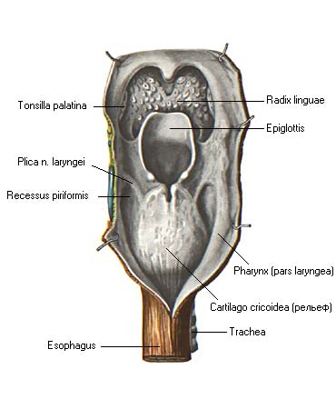Полость гортани, cavum laryngis, имеет форму песочных часов. Верхняя расширенная часть, называемая преддверием гортани, vestibulum laryngis, простирается от входа в гортань, aditus laryngis, до уровня складок преддверия, plicae vestibulares. Вход в гортань ограничен спереди задней поверхностью надгортанника, сзади — верхушками черпаловидных хрящей и по бокам — черлалонадгортанными складками, plicae aryepiglotticae. Между plicae aryepi-glotticae и внутренней поверхностью щитовидного хряща с обеих сторон образуется грушевидный карман, recessus pirifor-mis (см. " Глотка"). Средняя суженная часть гортани — собственно голосовой аппарат, glottis, ограничен вверху преддверными, а внизу голосовыми складками; он имеет вид сагиттально расположенной щели, ограниченной с боков двумя парами упомянутых складок. Щель между складками преддверия называется щелью преддверия, rima vestibuli, а между голосовыми связками — голосовой щелью, rima glottidis. В последней различают два отдела: