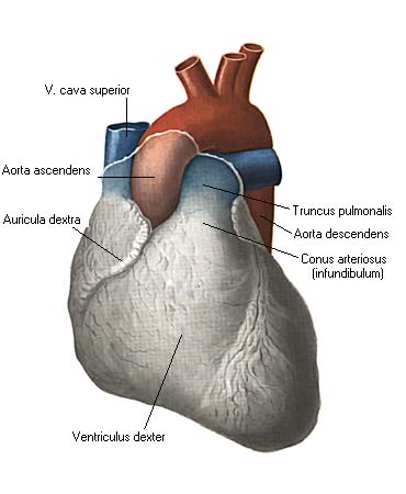 Восходящая аорта, aorta ascendens, является продолжением conus arteriosus левого желудочка и начинается от его ostium aortae. Позади левой половины грудины на уровне третьего межреберья она направляется вверх, немного вправо и вперед и доходит до уровня хряща II ребра справа, где продолжается в дугу аорты. Начальная часть восходящей аорты расширена и называется луковицей аорты, bulbus aortae. Стенка луковицы образует три выпячивания — синусы аорты, sinus aortae. соответствующие положению трех полулунных заслонок аорты. Так же как и заслонки, эти синусы обозначают: правый, левый и задний. От правого синуса берет начало a. coronaria dextra, а от левого — a. coronaria sinistra (см. " Сердце").